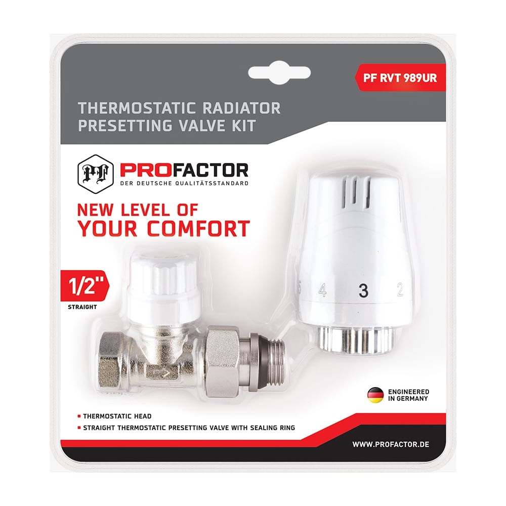 Комплект радиатора PROFACTOR термостатический, прямой, с преднастройкой и уплотнением, 1/2 PF RVT 989UR предназначен для подключения отопительных приборов и плавного регулирования теплового режима в помещении за счет изменения расхода теплоносителя в отопительных системах, может использоваться в однотрубных и двухтрубных системах отопления. Применение термостатический комплекта позволяет уменьшить потребление тепловой энергии.