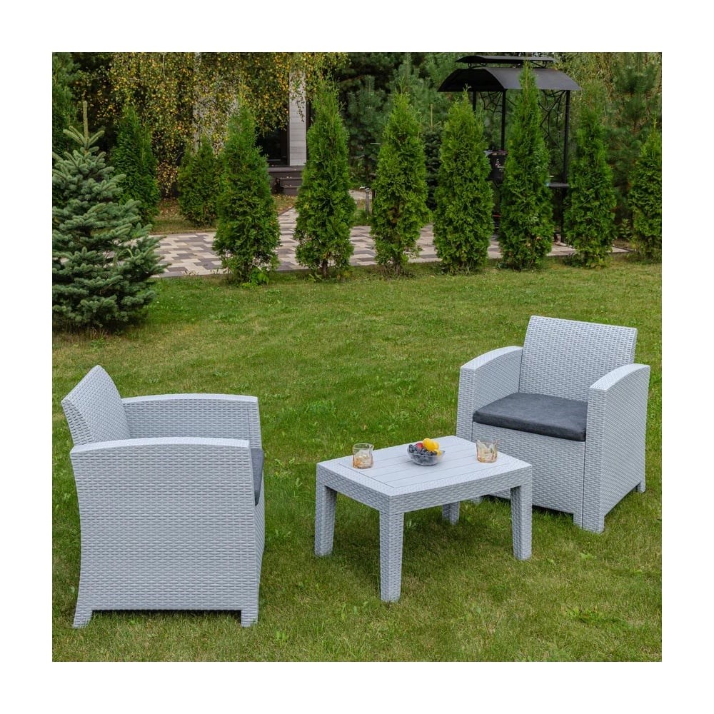 Комплектация и габариты:Кресло(2 шт.) - 68х66х76 смКофейный стол - 70,5х50,5х38,5 смМатериалы:Материал комплекта - окрашенный в массе полипропилен с повышенной прочностьюЦвет комплекта - светло-серыйЦвет подушек - серыйМатериал чехлов подушек - полиэстерМатериал наполнителя подушек - поролонДополнительная информация:Количество посадочных мест – 2 человекаМаксимальная нагрузка на посадочное место - 120 кгПоставляется в разобранном видеПодушка в комплекте - даТемпературный режим - от -50C до +50C