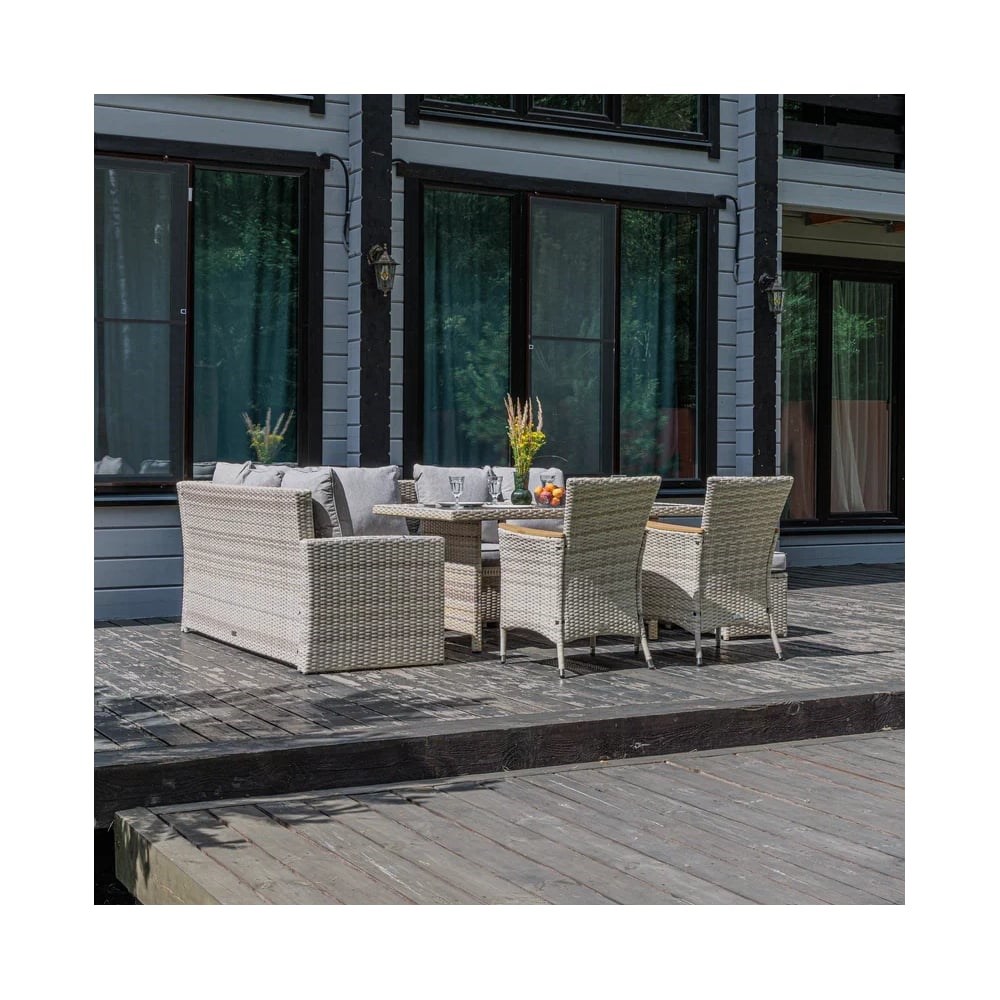 Комплектация и габариты:Диван прямой - 171x71x81 смДиван угловой- 183x71x81 смКресло(2 шт.) - 60х59х87 смОбеденный стол - 150x90x70 смПуф (2 шт.) - 40x40x33 смМатериалы:Материал комплекта - искусственный ротанг (ручного плетения)Материал каркаса – сталь, окрашенная порошковым методомМатериал столешницы - закаленное стеклоМатериал подлокотников кресла - поливуд (искуссвенное дерево)Материал чехла на подушки - олефин (водоотталкивающая ткань)Материал наполнителя подушек под спину - синтетический пухМатериал наполнителя подушек для сидения - поролонЦвет комплекта - БежевыйЦвет подушек - БежевыйДополнительная информация:Количество посадочных мест – 9-11 человекМаксимальная нагрузка на посадочное место - 150 кгЧехлы съемные - даТемпературный режим - от -50C до +50CСочетается с комплектами бренда ROYAL FAMILY в бежевом цветеНакладки на ножки - да (пластиковые)Категория ротанга - первичнаяДержатели и крепления подушек зависят от поставки и не являются неотъемлемой частью комплекта