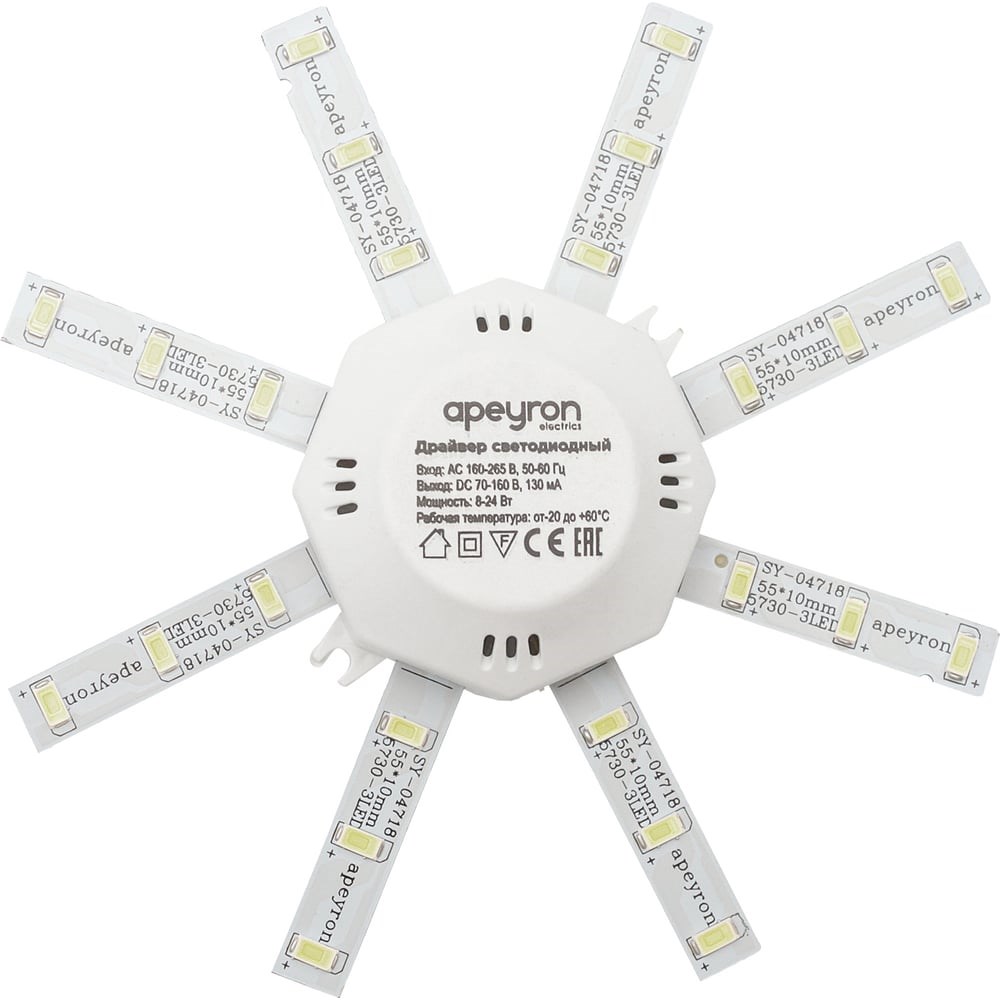 Комплект светодиодных линеек “Звездочка” от Apeyron предназначен для замены стандартных ламп, а также современных светодиодных источников свечения, которые уже повсеместно используются в настенно-потолочных светильниках.Преимуществами изделия являются: повышенный уровень освещенности и длительный срок службы за счет большей площади охлаждения. Благодаря большей площади охлаждения срок службы будет в разы больше. Световой поток равен 600 лм, что эквивалентно 60 Вт.Цветовая температура равна 6400 К, что соответствует холодному белому цвету свечения, который повышает концентрацию, настраивает на рабочий лад. Угол рассеивания светодиодов, используемых в изделии, равен 120°, что позволяет полностью осветить плафон и сделать освещение более качественным.Набор светодиодных линеек в собранном виде имеет круглую форму и соответствует размеру с диаметром 140 мм и толщиной драйвера 22,5 мм. Драйвер контактирует с линейками только в месте их подсоединения, что позволяет улучшить охлаждение компонентов набора.Изделие работает от напряжения 220 В и не требует дополнительных устройств для подключения. Благодаря отсутствию мерцания светового потока отлично подходит для использования в жилых помещениях, а также административных, медицинских и производственных учреждениях.