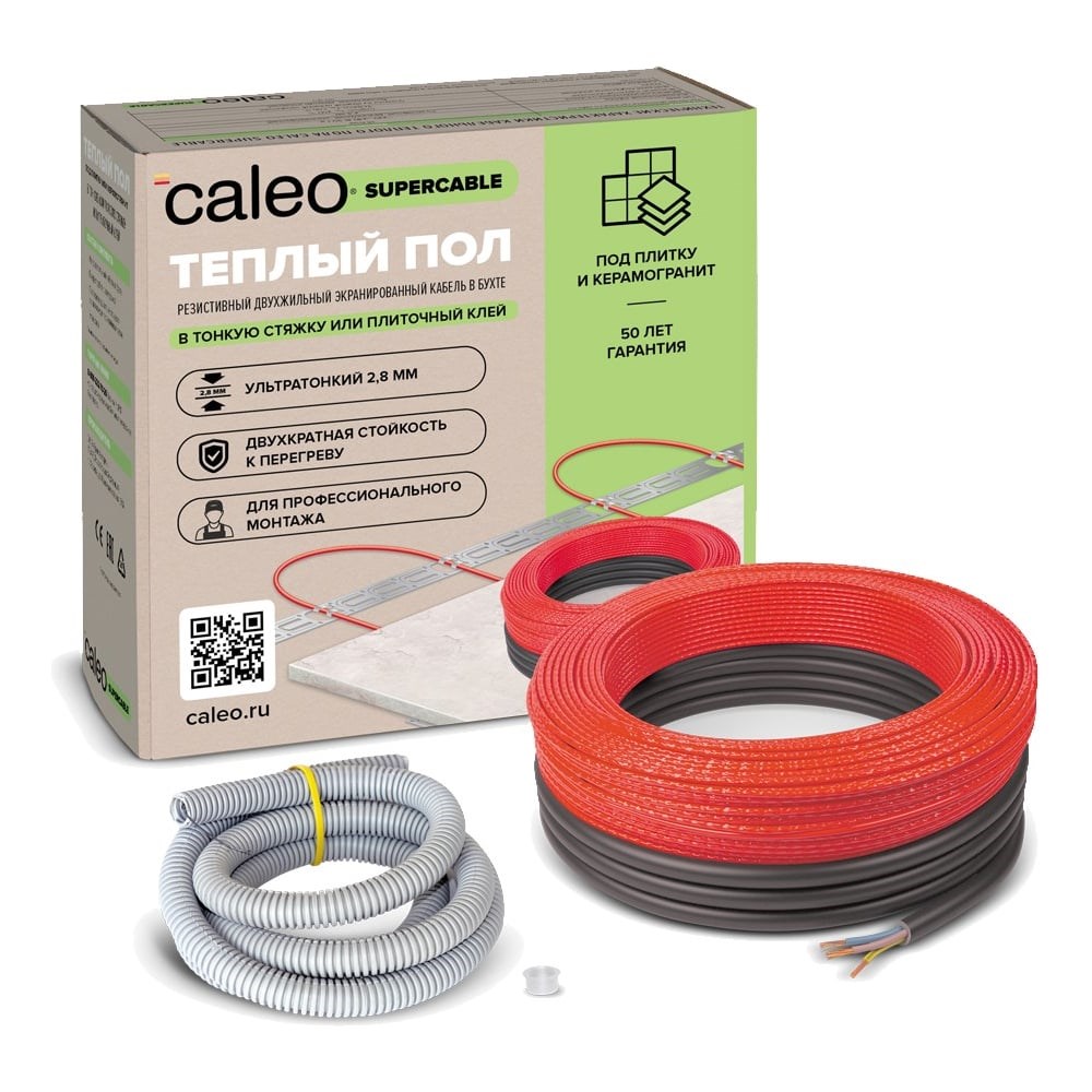 Комплект теплого пола CALEO Supercable 18W-10 предназначен для монтажа в тонкую стяжку, плиточный клей или наливной пол. Кабельный теплый пол обеспечивает подогрев поверхности пола для создания дополнительного комфорта или основного обогрева помещения. Область применения: гостиные, кухни, ванные комнаты, столовые, детские комнаты. Рекомендуемые напольные покрытия: керамическая плитка, керамогранит, природный камень.Особенности CALEO SUPERCABLE:Сверхтонкий (2,8 мм) нагревательный кабель в бухте на основе двухжильного экранированного резистивного кабеля повышенной надежности, не уменьшает высоту помещения;Идеален для монтажа в помещениях co сложной конфигурацией;Возможность укладки во влажных помещениях;18 Вт/ пог. м или 130-200 Вт/м2 (зависит от шага укладки витков кабеля) - для стандартных и холодных помещений, для комфортного или основного обогрева;Наружная и внутренняя изоляция из высокотемпературного фторполимера;Экран в виде оплетки из медной луженой проволоки;Гарантия - 50 лет.Строение кабеля CALEO SUPERCABLE:Внешняя оболочка кабеля (фторполимер);Экран;Оболочка нагревательных жил (фторполимер);Нагревательная жила.