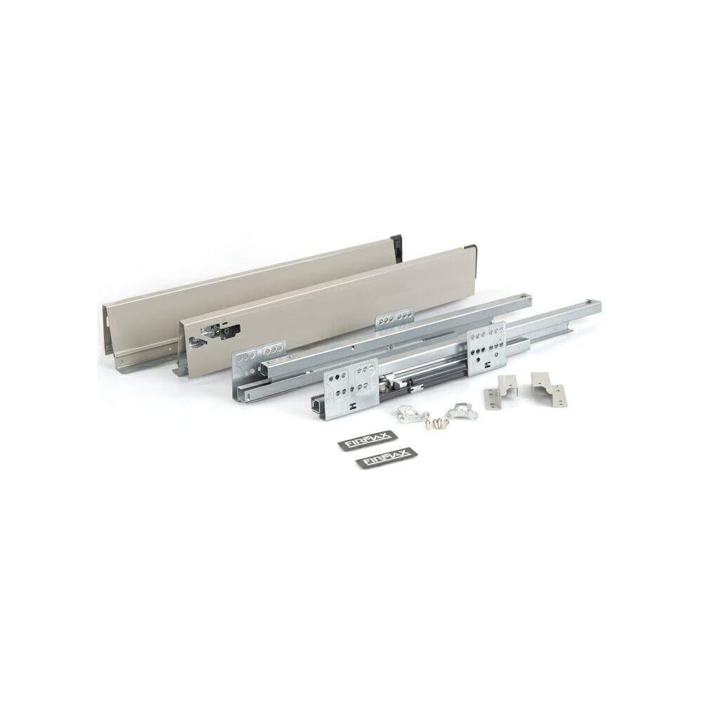 Ящик Firmax Newline базируется на направляющих полного выдвижения. Каждая из направляющих содержит в себе: Механизм обратного демпфирования (данный механизм предназначен для компенсации шума, появляющегося при ударе подвижной части направляющей о неподвижную). Доводчик, длина хода которого составляет 50 мм, предназначен для плавного закрытия ящика. Механизм синхронизации, предназначенный для улучшения боковой стабилизации ящика и снижения уровня шума, при открытии/закрытии ящика. Боковины ящика. Каждая из боковин содержит в себе механизм регулировки фасада.