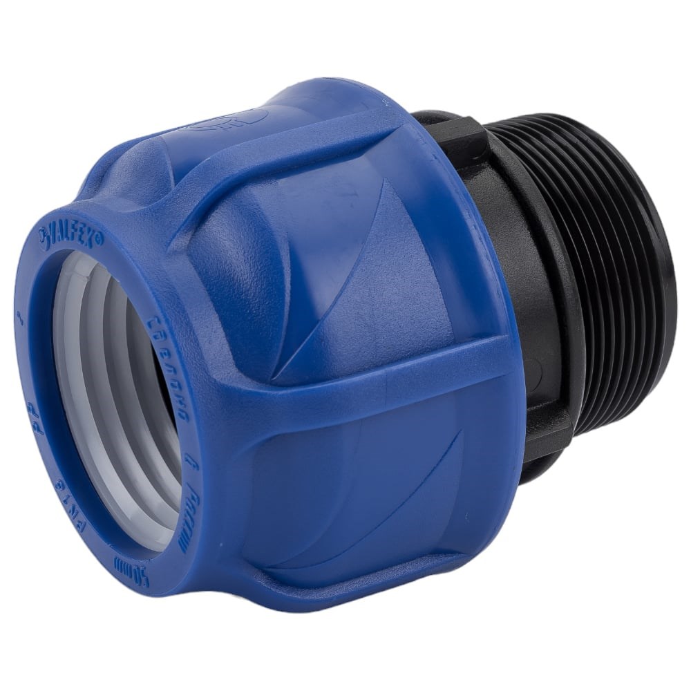 Компрессионная соединительная муфта VALFEX ПНД, c наружной резьбой, 50x2" 121001150200 выполнена из полипропилена и применяется для соединения полиэтиленовых труб кольцевого сечения по ГОСТ 18599 и/или ГОСТ 32415-2013. Предназначена для транспортирования воды с температурой до 40° С и максимальным рабочим давлением 1,6 МПа в системах хозяйственно-питьевого водоснабжения, а также для транспортирования других жидких сред, к которым материал фитинга и его уплотнительных элементов химически стоек. Используется для монтажа в системах питьевого водоснабжения и орошения. Рабочая температура - 20°С.