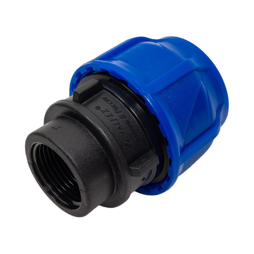Компрессионная соединительная муфта VALFEX ПНД, c внутренней резьбой, 40x1" 121001240100 выполнена из полипропилена и применяется для соединения полиэтиленовых труб кольцевого сечения по ГОСТ 18599 и/или ГОСТ 32415-2013. Предназначена для транспортирования воды с температурой до 40° С и максимальным рабочим давлением 1,6 МПа в системах хозяйственно-питьевого водоснабжения, а также для транспортирования других жидких сред, к которым материал фитинга и его уплотнительных элементов химически стоек. Используется для монтажа в системах питьевого водоснабжения и орошения. Рабочая температура - 20°С.