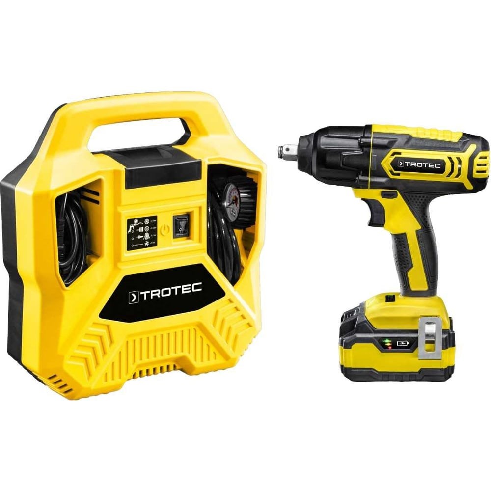 Компрессор PCPS 10-1100 Легкая и прочная конструкция корпуса идеально подходит для мобильного использования Мощный двигатель 1100 Вт для работы при давлении до 8 бар Работа без масла и обслуживания Компактное встроенное решение обеспечивает легкую транспортировку и компактное хранение 3-метровый шланг для сжатого воздуха с быстроразъемным соединением Набор из 9 адаптеров для всех распространенных клапанов в комплекте. Большой радиус действия благодаря прорезиненному соединительному кабелю длиной 5 метров Аккумуляторный ударный гайковерт TROTEC PIWS 10-20В Холостой ход [мин -1 ] 1-я передача 0 - 2300 Частота хода комбинированная 1-я передача 0 - 3000 об/мин Количество ступеней крутящего момента 4 Максимальный крутящий момент [Нм] 400 Держатель инструмента 1/2 "квадратная головка Максимальный диаметр шурупа по дереву [мм] 23 Максимальный диаметр шурупа по металлу [мм] 23 Колесные гайки [мм] 23 Электрические значения батареи Батарея - номинальное напряжение [В] 20 Батарея - Емкость [Ач] 4 Индикатор емкости 3 уровня Тип батареи литий-ионный Аккумулятор - время зарядки [ч] 1,5 Подключение питания 230-240В, 50Гц Выходное напряжение [В] 21,5 Потребляемая мощность [Вт] 94 Номинальное потребление тока [мА] 3500 Соединительная вилка ЦВЕ 7/16 Длина кабеля [м] 1,5 Класс защиты II Блокировка питания Квадратный переходник 1/2" Бесступенчатая регулировка скорости с быстрой остановкой Выбор крутящего момента Правое/левое вращение Сменный аккумулятор Встроенный светодиодный рабочий свет