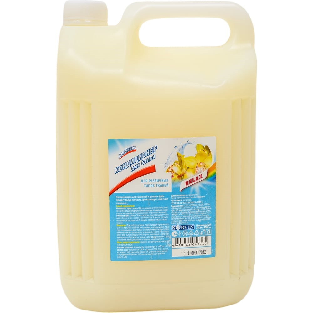 Кондиционер для белья Свежинка RELAX 5л 00-00000813 бережно ухаживает за всеми типами ткани и придаёт особую мягкость белью после стирки. Кондиционер полностью выполаскивается из ткани и не остаётся на одежде, облегчает процесс глажки и обладает антистатическим эффектом. Придаёт белью приятный аромат.