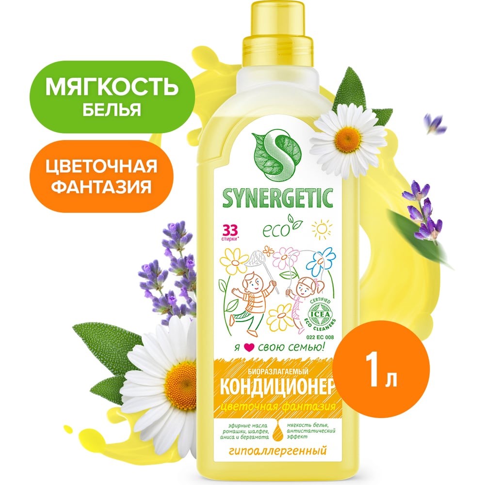 Гипоаллергенный кондиционер-ополаскиватель для белья SYNERGETIC «Цветочная фантазия» – высокоэффективное средство, бережно ухаживающее за всеми типами ткани и придающее особую мягкость белью после стирки. Обладает антистатическим эффектом. Комплекс растительных К-тензидов обеспечивает легкую глажку белья. Гипоаллергенная отдушка с маслами ромашки, шалфея, аниса и бергамота придаёт белью нежный аромат. Подходит для ручной и машинной стирки, полностью выполаскивается из тканей. Международный экологический сертификат ICEA подтверждает биоразлагаемость, безопасность и эффективность средства. Гипоаллергенный кондиционер-ополаскиватель нейтрализует остатки средств для стирки на тканях. Безопасен для септических установок.