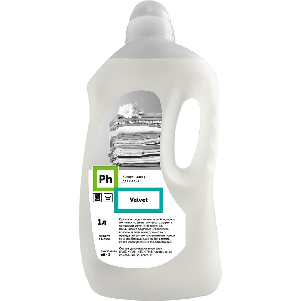 Ph Velvet Кондиционер для белья. Формула кондиционера для белья разработана для профессионального и бытового применения. Обеспечивает защиту тканей, придает им мягкость, антистатический эффект, свежесть и облегчает глажение. Подходит для всех видов тканей, кроме маркированных как огнестойкие. Кондиционер сохраняет целостность текстильных волокон, защищает их от преждевременного изнашивания и потери яркости. Лёгкий цветочный аромат придает белью свежесть. Не вызывает раздражения кожи и дыхательных путей.Область применения: в лечебно-профилактических, санитарно-курортных, детских, дошкольных, школьных и других образовательных учреждениях, предприятиях торговли, общественного питания, в различных областях промышленности (в том числе пищевой).Способ применения: перемешать непосредственно перед использованием.Стирка в стиральной машине: добавьте в кювету для кондиционера из расчета 3 колпачка на 5 кг белья.При ручной стирке: Растворите 1 колпачок кондиционера в 10 литрах воды перед последним полосканием. Прополощите белье в приготовленном растворе.Состав: 5 - 15 % К-ПАВ, <5% Н-ПАВ, парфюмерная композиция, консервант.