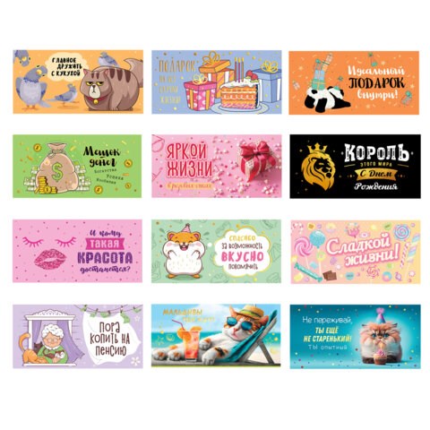 Конверт "Креатифф" изготовлен из высококачественного картона плотностью 215 г/м2. Представлен в 12 универсальных дизайнах (без возможности выбора). Отделка - блестки или фольга. Размер - 166х82 мм.