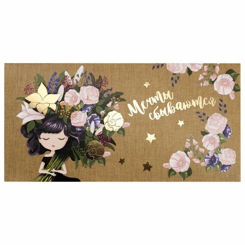 Конверт с надписью "МЕЧТЫ СБЫВАЮТСЯ" изготовлен из высококачественного картона плотностью 215 г/м2. Выполнен в бежевом цвете с изображением девушки и цветочным принтом. Отделка - фольга. Размер - 166х82 мм.