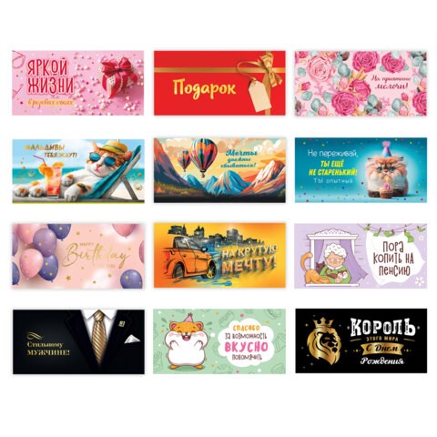 В состав набора входит 12 конвертов разных цветов и дизайнов. Благодаря разнообразию дизайнов, вы сможете выбрать подходящий вариант для любого случая. Каждый конверт изготовлен из высококачественного картона плотностью 215 г/м2. Отделка - глянцевая ламинация. Размер - 166х82 мм.