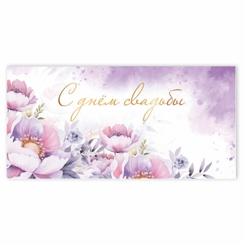 Конверт с тематическим свадебным принтом и надписью "С ДНЁМ СВАДЬБЫ!" изготовлен из высококачественного картона плотностью 215 г/м2. Отделка - блестки. Размер - 166х82 мм. Поставляется в 2 разных дизайнах (без возможности выбора).