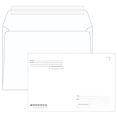 В конверт формата С4 можно вложить документ формата А4. На передней стороне конверта имеются адресные указатели: "Куда", "Кому", "От кого", "Откуда". Плотность бумаги 100 г/м2 позволяет размещать тяжелую корреспонденцию, а также скроет ее от посторонних глаз. Отрывная полоса типа STRIP обеспечивает надежное запечатывание конверта и сохранность личного письма или важного документа.