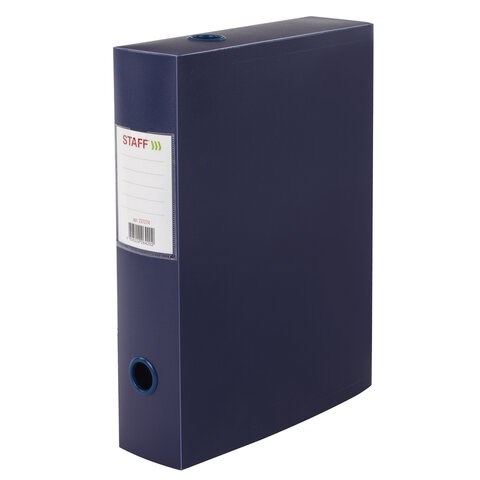 Вмещает до 750 листов формата А4. Изготовлен из прочного пластика синего цвета толщиной 0.7 мм. В закрытом виде фиксируется с помощью металлической кнопки. Размер - 330х245х70 мм. Сменная этикетка в кармане на корешке.