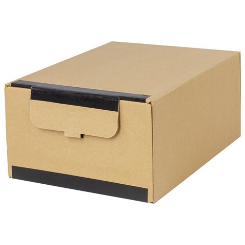 Изготовлен из гофрокартона толщиной 3 мм. Имеет поля для записей на лицевой стороне. Вмещает до 1700 листов. Выдерживает до 15 кг. Размер короба - 38x28.5x17 см. Имеет откидную крышку и закрывается на липучку. Поставляется в разобранном виде.
