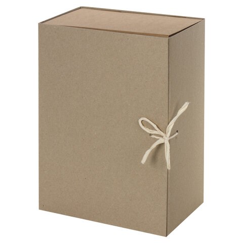 Вмещает до 1400 листов формата А4, в том числе картонные скоросшиватели, папки с завязками, обложки “Дело”. Изготовлен из переплетного картона толщиной 1.25 мм. В закрытом виде фиксируется с помощью двух хлопчатобумажных завязок. Способен выдержать 5 кг. Имеется откидная крышка. Выполнен в сером цвете. Размер - 330х150х240 мм.