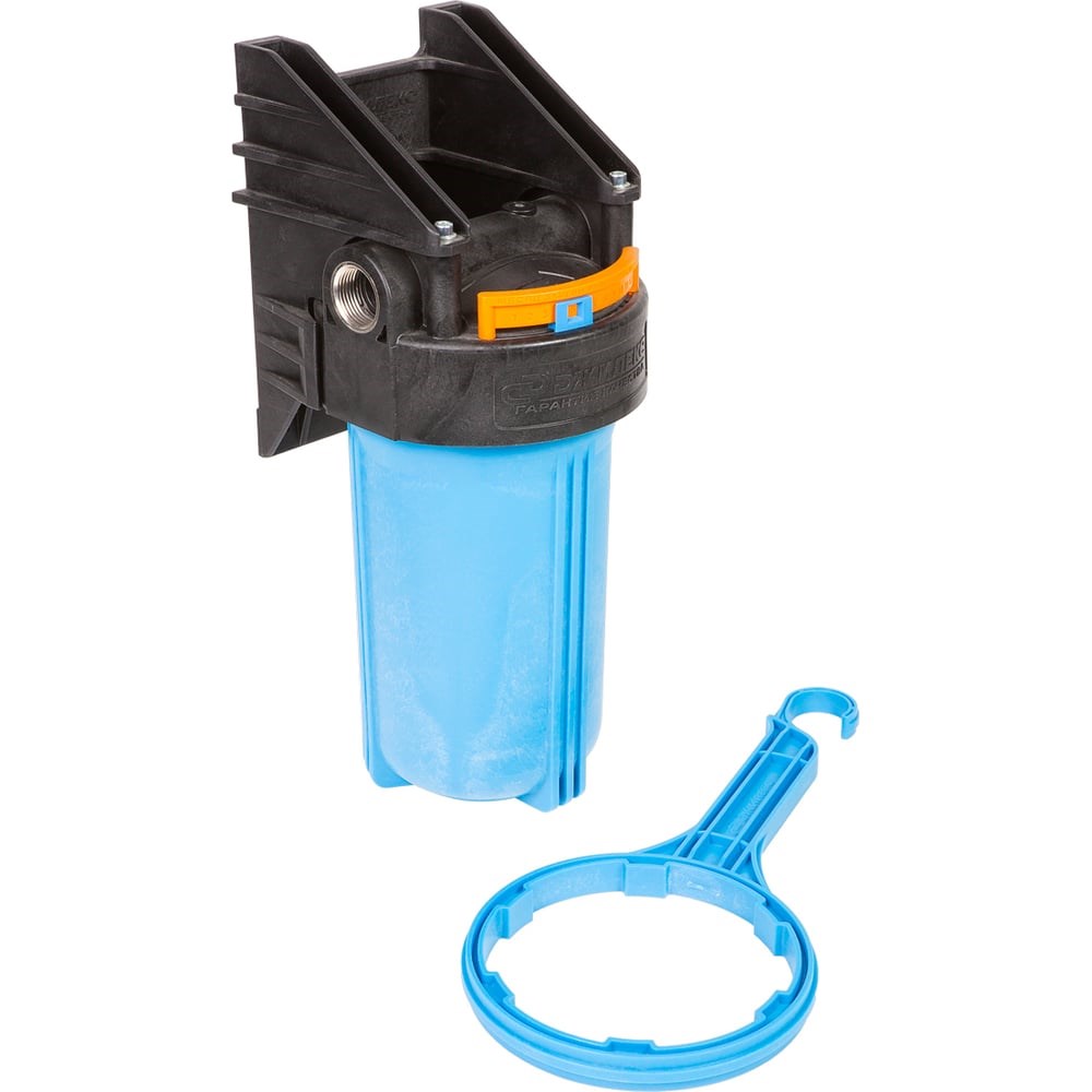 Корпус для картриджного фильтра Джилекс 1 М 10” 9054 - позволяет очистить воду в домашних условиях. На крышке корпуса установлены: календарь для удобства отслеживания даты последней замены фильтрующего элемента и пробка для сброса избыточного давления при замене фильтрующего элемента. Для слива остаточной воды из корпуса фильтра (при замене фильтрующего элемента) на корпусе предусмотрена резьбовая заглушка, находящаяся на дне колбы фильтра. Для монтажа к стене на крышке корпуса предусмотрен кронштейн. Колбу/накидную гайку необходимо откручивать/затягивать с помощью специального ключа, входящего в комплект.