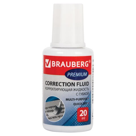Корректирующая жидкость BRAUBERG "Premium" быстросохнущая, 20 мл, с губчатым аппликатором, 224090