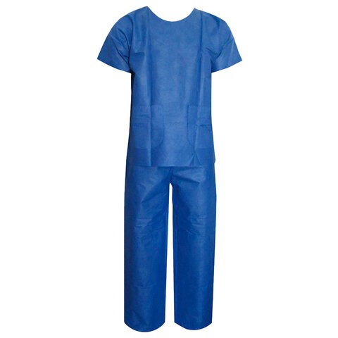 Костюм хирургический (рубашка + брюки). Размер 52-54. Костюм состоит из рубашки и брюк. Рубашка прямого силуэта, без застежки, рукав короткий. Брюки прямые. Швы наружные сварные (безниточные). Изготовлен из гипоаллергенного, безворсового, воздухопроницаемого, водоотталкивающего полипропиленового нетканого материала плотностью 42 г/м2. Упаковка: полиэтиленовый пакет. Нестерильный. Срок годности 4 года.