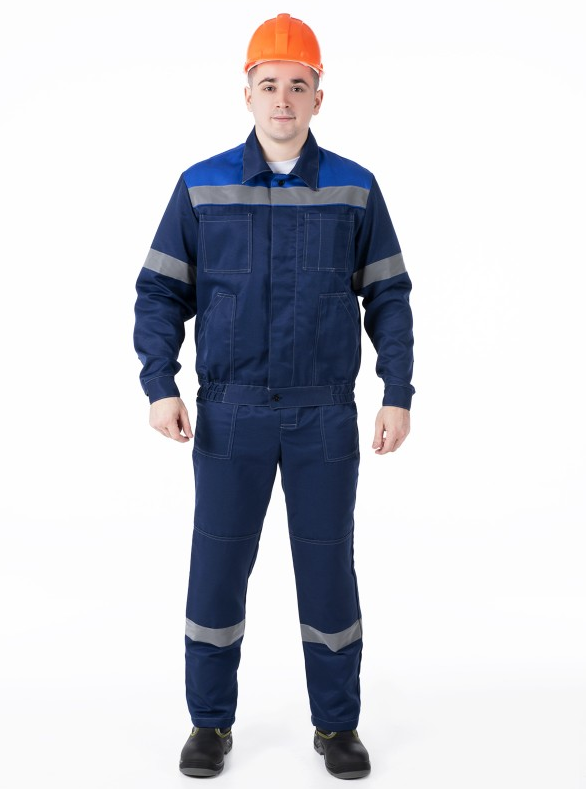 Куртка укороченная, прямого силуэта, с отложным воротником, с супатной застежкой, с притачным поясом с эластичной лентой по боковым швам, накладными верхними и нижними карманами, рукавами с манжетами на пуговицах и с налокотниками. В куртке предусмотрена лента светоотражающая 50мм.Полукомбинезон с застёжкой гульфика на тесьму «молния», застёжкой в правом боковом шве на 3 петли и пуговицы, отрезной грудкой, верхним и нижними боковыми карманами, с наколенниками, с эластичной лентой по спинке. На нижних частях под наколенниками настрочен лента светоотражающая 50мм.