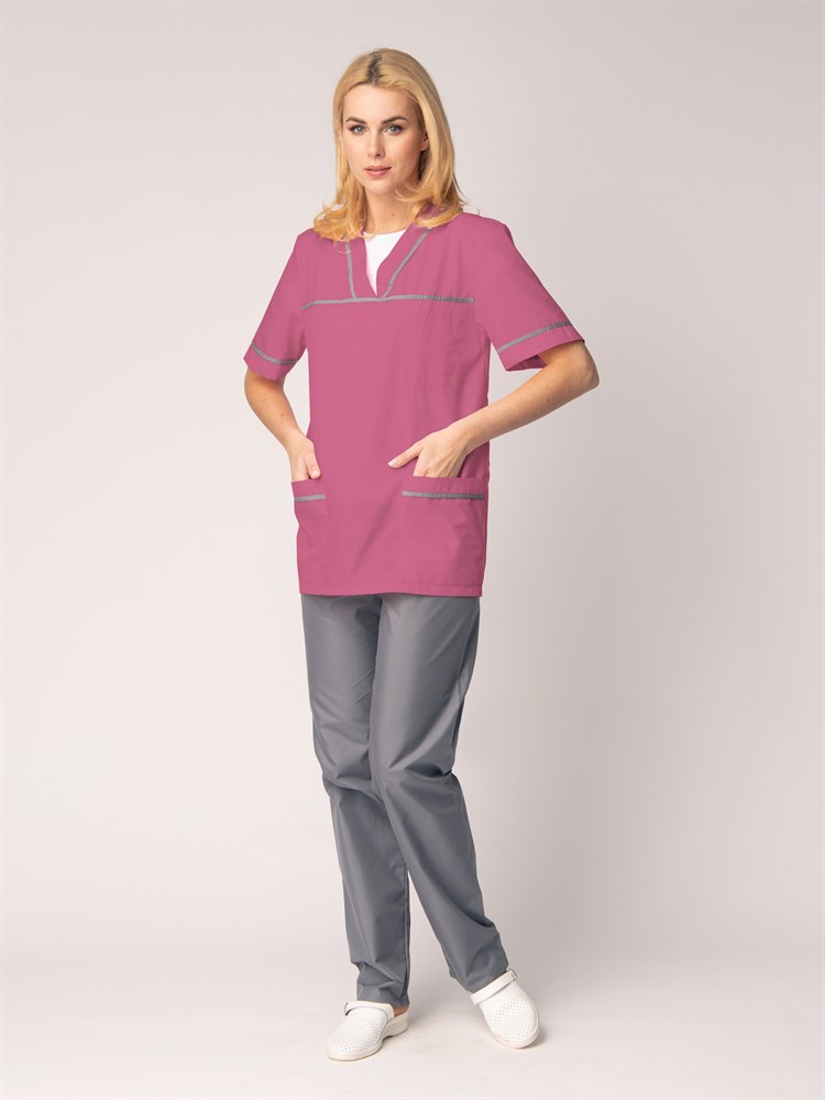 Стильный женский медицинский костюм «Ирис» разработан для сотрудниц медицинских учреждений, салонов красоты, массажных кабинетов или стоматологий. Костюм медицинский женский состоит из двух предметов: блузка + брюки женские. Спецодежда изготовлена в соответствии с ГОСТ, надежно защищает от общих производственных загрязнений. Костюм выполнен в нежных пудровых оттенках, замечательно сидит по фигуре. Прямая удлиненная блуза не стесняет движения, комфортна в работе. Для хранения мелочей предусмотрены вместительные карманы: боковые и нагрудный. Декоративный кант на карманах, горловине и кокетке придает костюму изысканный внешний вид. Рабочие брюки оснащены поясом из эластичной тесьмы для комфортной работы в течение длительного периода времени. Костюм изготовлен из легкой дышащей ткани, которая не выцветает и не садится после многократных стирок.