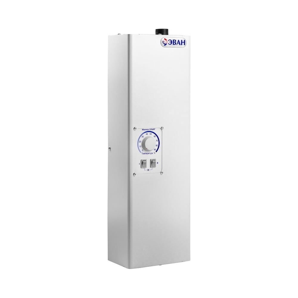 Котел Эван 12952 Warmos Start - 12 12952  12312 предназначен для отопления дач, частных домов, небольших торговых и складских помещений. Прибор имеет небольшие габариты, что упрощает установку, а белый цвет отлично впишется в любой интерьер комнаты. Котел изготовлен из нержавеющей стали - долговечного материала, который не подвержен коррозии. Оснащен самовозвратным аварийным термовыключателем, который сводит к минимуму перегрев котла. Прибор можно использовать с системами «теплый пол» при условии установки трехходового смесительного клапана или гидрострелки.