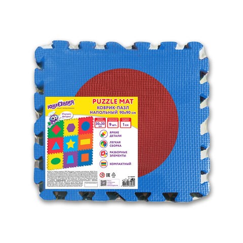 Коврик-пазл напольный 0,9х0,9 м, мягкий, "Фигуры", 9 частей 30х30 см, толщина 1 см, ЮНЛАНДИЯ, 664664