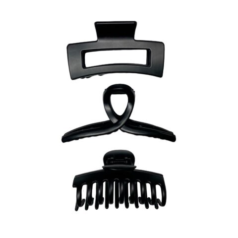 Набор из трех матовых крабов в классическом черном цвете — основа для любых образов. Разные размеры (8,5 см, 9 см, 11 см) позволяют комбинировать их в сложных укладках: