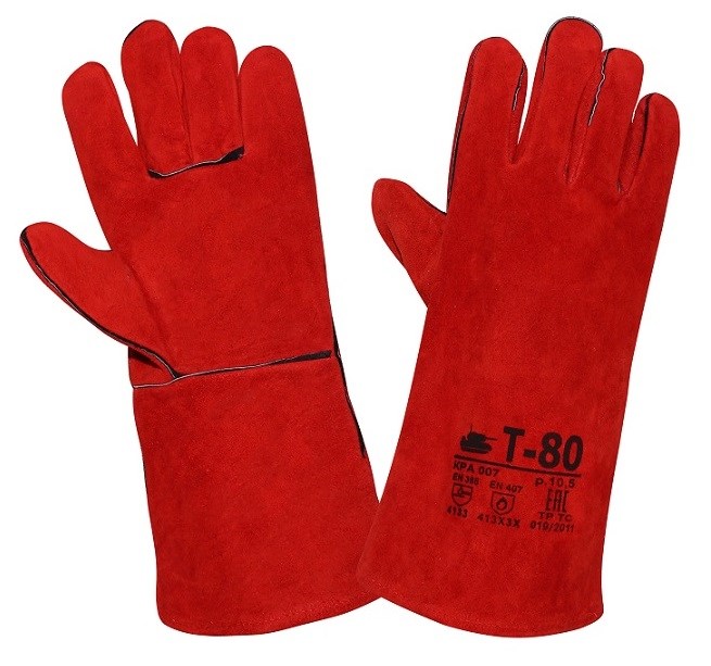 Перчатки сварщика (краги) Т-80 спилковые красные предназначены для защиты рук от механического воздействия (истирание, прокол, порез), искр и брызг расплавленного металла и работ в условиях повышенных температур. Перчатки пятипалые с подкладкой из флиса и брезента, длина 350 мм (+10/-5мм). Окрашенный спилок КРС сорта АВ (1,4 +/- 0,2 мм), обработка, обеспечивающая сохранение мягкости спилка в течение длительного времени хранения, швы усилены вставками из кожи черного цвета, используется специальная упрочненная нить. - Материал основы: спилок КРС сорт АВ - Подкладка: флис (320 гр.м2) +лен (200 гр.м2) - Манжета: крага - Эксплуатационные уровни: EN388 – 4133; EN407–413х3х - Толщина, мм: 1,4 - Длина, мм: 350 - Размер: 10,5