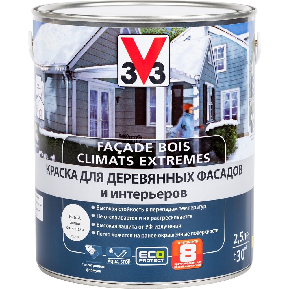 Краска для деревянных фасадов и интерьеров V33 CLIMATS EXTREMES полуглянцевая база А 110368 наносится на деревянную поверхность. Краска устойчива к перепадам температур. Покрытие легко ложится на застаревший слой краски, не растрескивается и не расслаивается. Обеспечивает высокую защиту от ультрафиолетовых лучей.