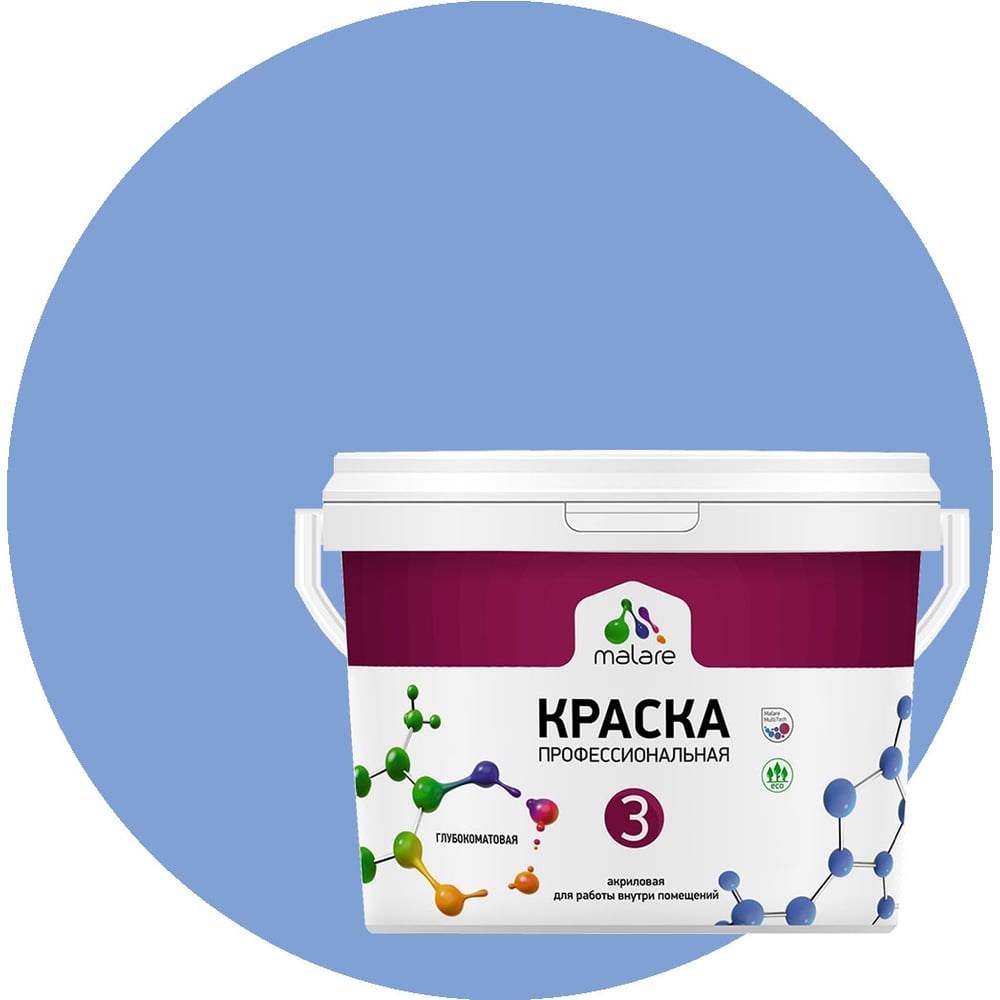 Краска MALARE Евро 3 для обоев, стен и потолков, стальной голубой, 2.7 л 2036769966217 предназначена для окраски стен, потолков и обоев в сухих жилых помещениях, в том числе детских комнатах, коридорах, кухнях, спальнях, гостиных комнатах, офисных помещениях, складских помещениях и т. д. Типы обрабатываемых поверхностей: Минеральные подложки: бетонные, кирпичные, монолитные и оштукатуренные поверхности, гипсокартонные и гипсоволокнистые плиты. Деревянные подложки: древесина, древесностружечные и древесноволокнистые плиты. Другие подложки: бумага, обои под окраску. Способ применения: Очистить поверхность от грязи и пыли, следов старого покрытия. Неровности зашпатлевать. Для формирования качественного и долговечного покрытия рекомендуют произвести грунтование поверхности в 1-2 слоя акриловой грунтовкой. Температура воздуха не ниже +5 градусов и относительная влажность не выше 80 %. Краску перемешать, при необходимости, разбавить водой не более 10% от объема. Благодаря составу, продукт равномерно распределяется по поверхности при помощи кисти, валика или краскопульта и образует матовое износостойкое покрытие, устойчивое к многократному мытью с применением мягких моющих средств.