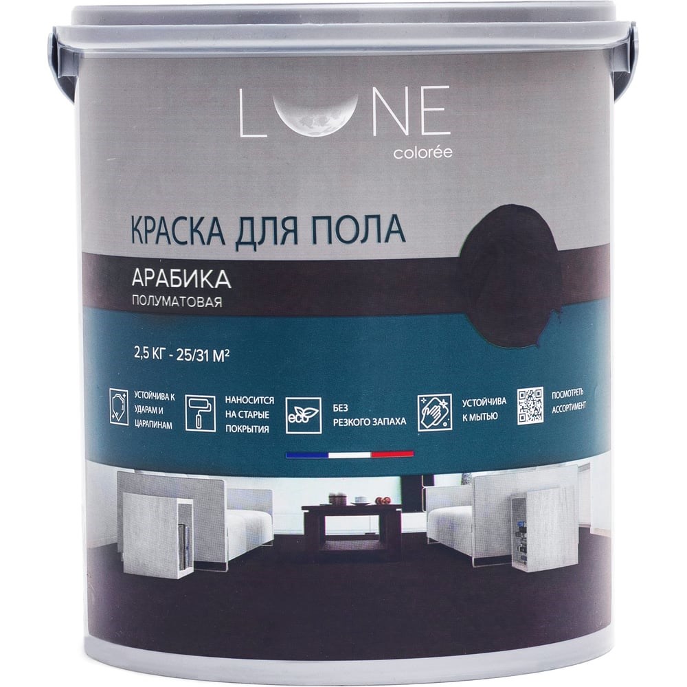 Краска для пола акриловая полуматовая быстросохнущая LUNE COLOREE, цвет Арабика (темно-коричневая), 2,5 кг. Краски для пола LUNE Coloree образует прочный и стойкий к истиранию каркас на поверхности пола и лестниц. Материал очень технологичный – легко наносится и не требует грунтовки. Акриловая краска для пола подходит для таких поверхностей как: дерево, в том числе лакированное и окрашенное, ламинат, паркет, бетон, МДФ, ДСП, так же допускается окраска террас, защищенных от прямого воздействия осадков. Продукт изготовлен на водной основе и не имеет резкого запаха. Окрашенная поверхность не скользит. Класс истирания (DIN EN13300): класс 1 (<5 мкм при 200 циклах истирания). Сухой остаток: не менее 40%. Плотность: 1,15-1,25 г/см³. Подготовка поверхности. Перед нанесением краски для пола поверхность необходимо очистить, обезжирить и хорошо просушить. Отслаивающиеся старые покрытия должны быть удалены. Гладкие высокоглянцевые поверхности рекомендуется предварительно зашкурить и обезжирить. Поверхности, образующие пыль (например, бетон), необходимо загрунтовать. Перед применением содержимое банки тщательно перемешать. Способ применения. В работе с краской для пола использовать валик, кисть, краскопульт. Рекомендуется покрытие 2-х и более слоев краски с межслойной сушкой не менее 2 часов. В случае необходимости снижения вязкости добавить не более 5% воды. Полное высыхание 24 ч. Для набора оптимальной прочности лакокрасочного покрытия необходимо 28 суток. Расход: 1 литр: 10-12 м².