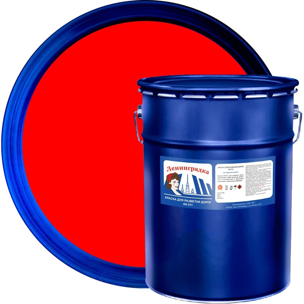 Краска для дорожной разметки Ленинградка АК-511 25 кг, красный УТ000006510 предназначена для формирования разметки на дорожно-асфальтовом покрытии (проезжая часть, автомобильные стоянки, пешеходные дорожки, взлетно-посадочные полосы). Краска легко наносится кистью, валиком или машинным способом. После высыхания продукт образует однородный гладкий слой без морщин, оспин и посторонних включений. Состав обладает устойчивостью к истиранию и химическим реагентам. Для получения светоотражающей поверхности, в краску можно добавить стеклянные шарики в соотношении 20-30% к массе.