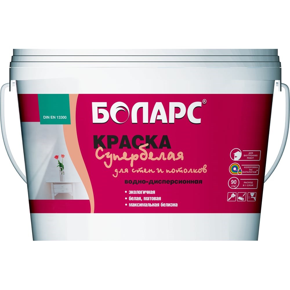 Краска БОЛАРС для стен и потолков супербелая 2100, 3.0 кг 00000005564 представляет собой продукт на акриловой основе, который отличается ярко-белым цветом и высоким коэффициентом светоотражения. Состав служит для окрашивания потолков в помещениях с нормальной влажностью. Особенно рекомендуется для помещений с недостаточным освещением. Краска легко наносится, быстро сохнет. При высыхании образует матовую поверхность, устойчивую к сухой уборке.