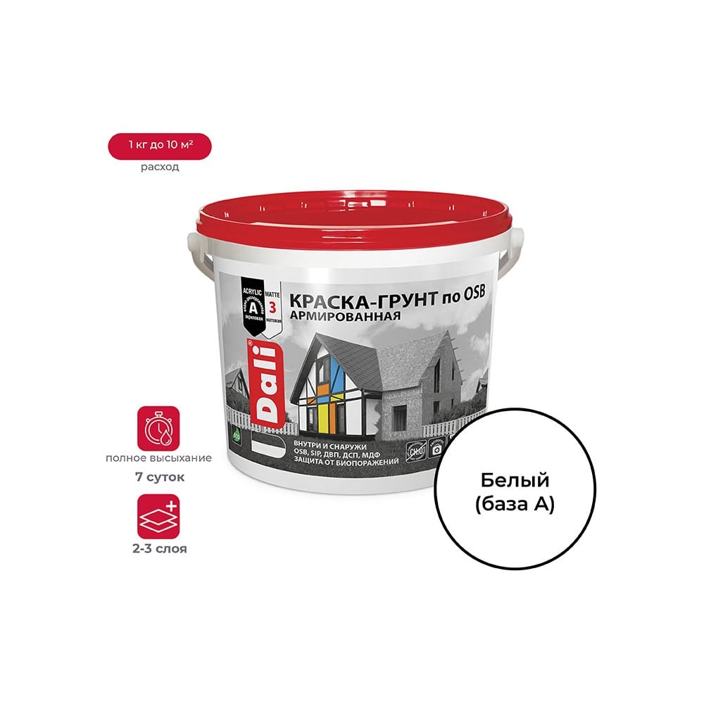 Используется в качестве грунта к последующей финишной отделке снижение. В качестве финишного покрытия и защитно-декоративная обработка фасадов, стен, потолков, архитектурных элементов и прочих поверхностей. Применяется для снаружи и внутри помещений, отапливаемых и неотапливаемых, в том числе с повышенной эксплуатационной нагрузкой и влажностью воздуха: по OSB-плитам любого класса, SIP-панелям, ДСП, ДВП, фанере, МДФ, фибролитовым и цементно-стружечным плитам в соответствии с их областью применения. Состав: полиакриловая дисперсия, армирующее волокно, диоксид титана, активные антисептические компоненты, микронизированный мрамор, адгезионные и другие функциональные добавки; Методы нанесения: кисть, валик, распыление; Разбавитель: вода; Температура применения: от +10 °С; Количество слоев: 2 - 3; Расход: 1 кг до 10 м²; Высыхание: межслойная сушка - 1 - 2 часа, окончательный набор прочности покрытия - 7 суток; Степень глянца: матовый; Колеровка: да, по каталогам: NCS 1950, Nova 2024, RAL; Цвет: белый; Вес: 6 кг. Белый (база A)