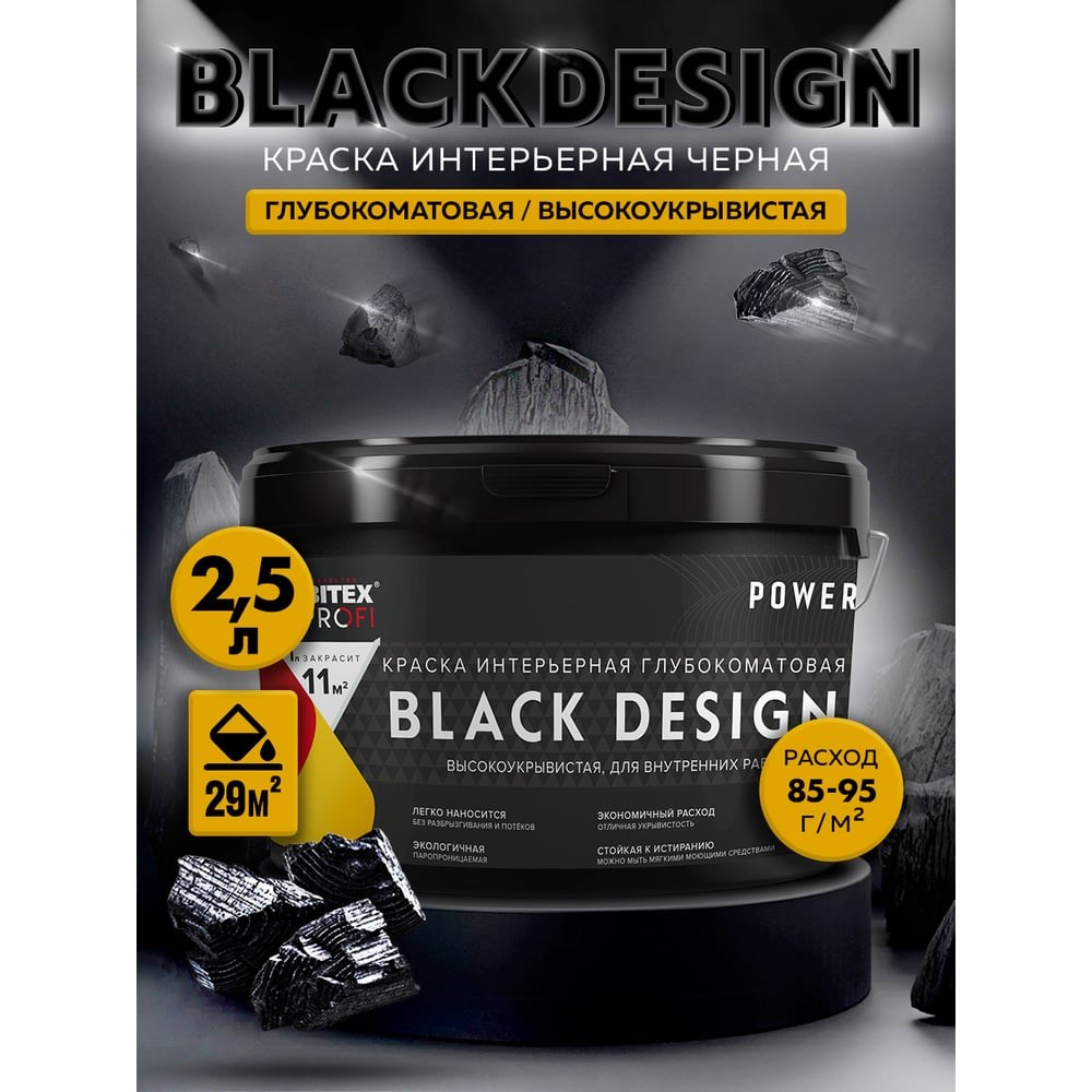 Готовая к применению высокоукрывистая акриловая чёрная краска для интерьеров BlackDesign. Предназначена для окраски стен и потолков, обоев внутри помещений с умеренной влажностью, таких как спальни, гостиные, кабинеты, коридоры, гардеробные и т.п. Идеальна для ресторанов, фотостудий, интерьеров. Обладает прекрасной адгезией, отличными малярными свойствами. Практически без запаха. Стойкость цвета до 10 лет.Высокоукрывистая. Легко наносится, без разбрызгивания и потёков. Повышенная стойкость к истиранию. Быстросохнущая. Экологичная. Глубокоматовая. Образует покрытие , устойчивое к мытью мягкой поролоновой губкой с добавлением мягких моющих средств.Расход 85-95 мл/на 1 м²- на один слой. Расход меняется в зависимости от предварительной подготовки поверхности и способа нанесения.