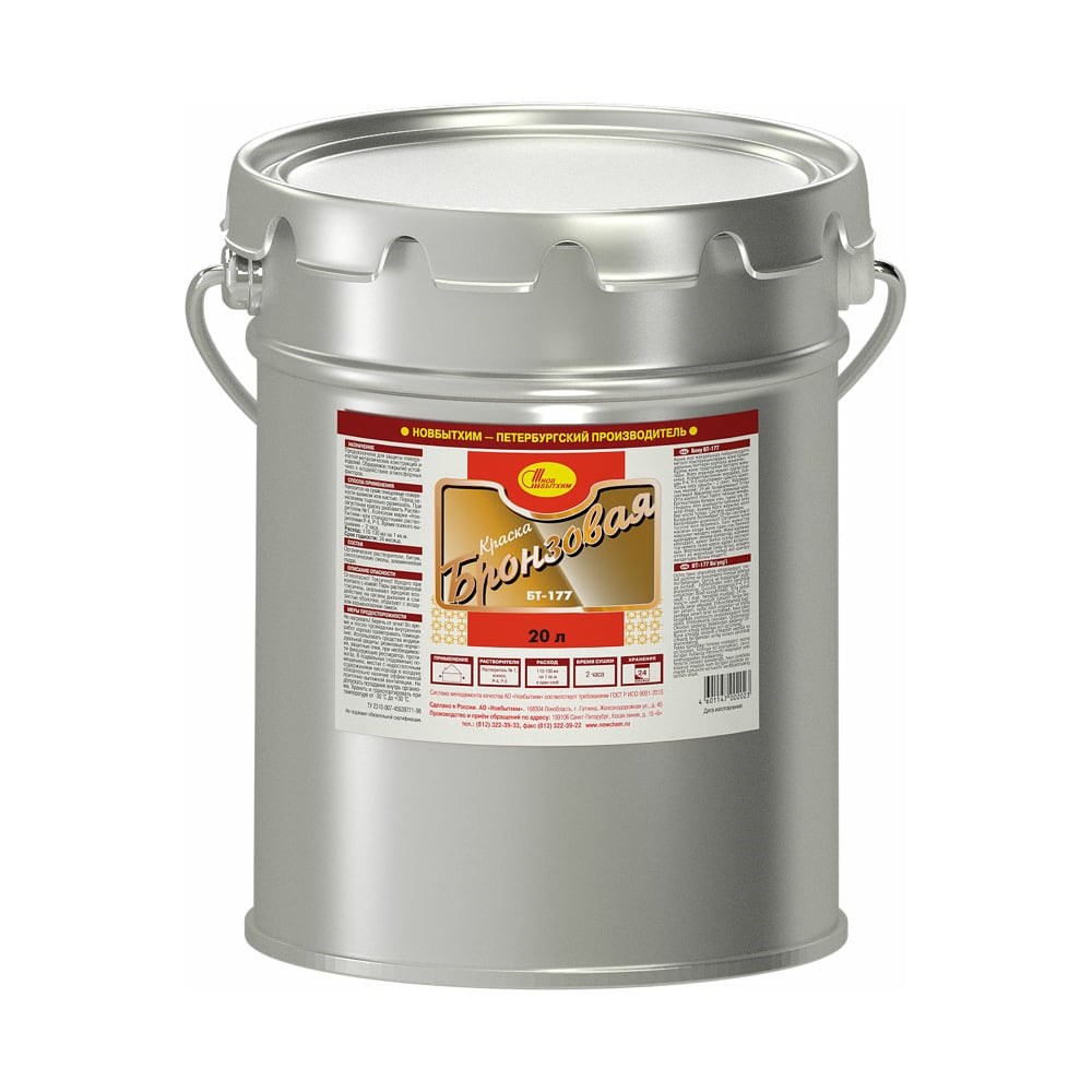 Краска НОВБЫТХИМ БТ-177 Бронзовая евроведро 20 л 666 предназначена для наружных работ с целью защиты и декоративного окрашивания металлических и бетонных конструкций и изделий (решёток, оград). Перед нанесением содержимое следует тщательно перемешать. Ограничения: Непригодны для окраски внутренних поверхностей емкостей для сбора и хранения воды, а также для окраски металлических поверхностей, нагревающихся свыше +90 °С Не рекомендуется наносить на поверхности, окрашенные масляными или алкидными (ПФ и ГФ) красками или эмалями, ввиду плохой адгезии к указанным поверхностям