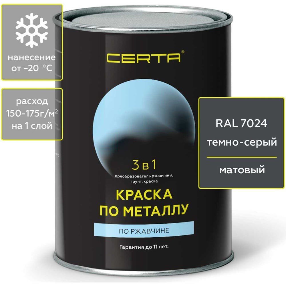 Сочетание вгрунт-краске свойств преобразователя ржавчины, антикоррозийной грунтовки ифинишной декоративной эмали позволяет применять еёдля защиты отржавчины идекоративной отделки металлических, железобетонных конструкций, стальных иалюминиевых поверхностей: крыш, водостоков, трубопроводов, линий электропередач, спецтехники. Срок службы покрытия— свыше 11лет, подтвержден испытаниями.Способ применения: Подготовка поверхности: очистить отзагрязнений, обезжирить растворителем CERTA (недопустимо использовать уайт-спирит, сольвент, бензин). Подготовка эмали: тщательно перемешать, при необходимости разбавить растворителем CERTA до10% отобщей массы. Способ нанесения: кисть, валик, краскопультНанесение: наносить неменее чем в2слоя столщиной покрытия 150-200мкм. Промежуточная сушка: 30минут при +20°С. Полное высыхание: 24часа. Хранение: хранить вплотно закрытой таре всухом помещении, предохраняемом отпрямого воздействия солнечных лучей ивлаги, при температуре от −30 °Сдо+40°С.Беречь отогня.