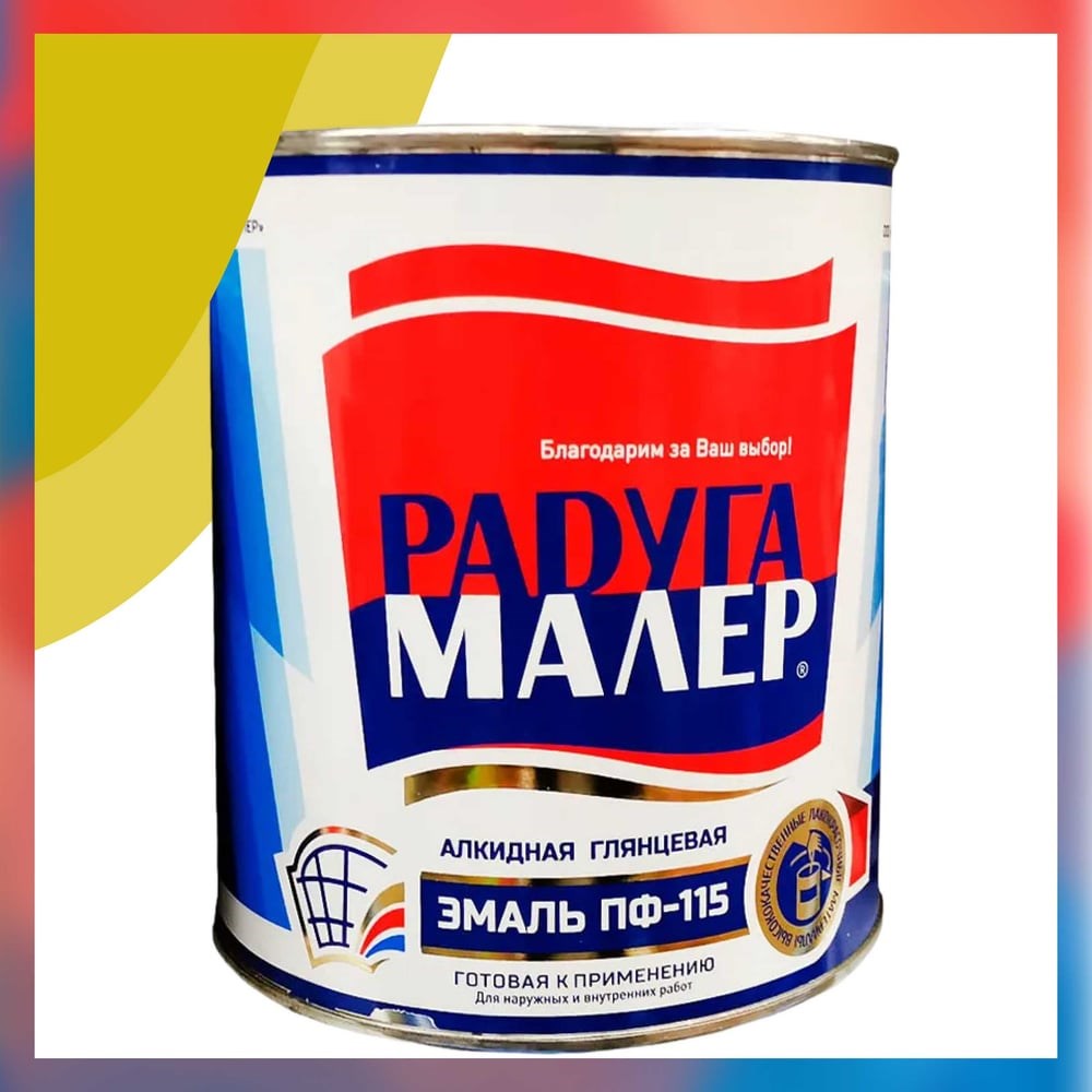 Краска быстросохнущая, атмосферостойкая Радугамалер ГОСТ ПФ-115 предназначена для окраски металлических, деревянных, бетонных, оштукатуренных и других поверхностей, подвергающихся атмосферным воздействиям, а также для отделочных работ внутри помещений. Степень блеска: глянцевая Расход: на однослойное покрытие 150-180 г/м2 Разбавитель: сольвент, уайт-спирит, скипидар, или их смесью не более 5% от массы эмали Способ нанесения: Перед применением эмаль тщательно размешать. Эмаль наносят краскораспылителем, валиком или кистью на сухую, предварительно очищенную от пыли, жировых или других загрязнений, ржавчины, окалины поверхность. Время высыхания каждого слоя эмали при температуре (20±2)°C - 24 часа.