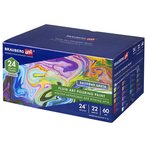Краски акриловые для техники "Флюид Арт" (POURING PAINT), НАБОР 22 цвета, 24 штуки по 60 мл, BRAUBERG ART, 192237