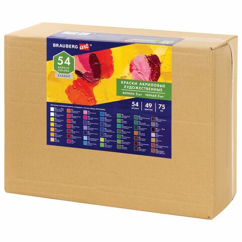 Краски акриловые художественные BRAUBERG ART CLASSIC, НАБОР 54 шт, 49 цветов, в тубах 75 мл, 191724
