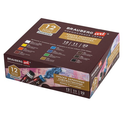 Краски акриловые художественные BRAUBERG ART PREMIERE, НАБОР 12 шт., в тубах по 22 мл, 191781