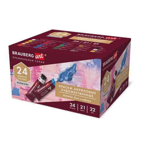 Краски акриловые художественные BRAUBERG ART PREMIERE, НАБОР 24 шт., в тубах по 22 мл, 191782