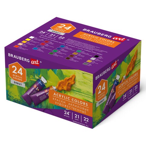 Краски акриловые художественные, НАБОР 24 штуки, 21 цвет по 22 мл, в тубах, BRAUBERG ART DEBUT, 192301