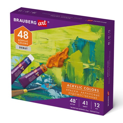 Краски акриловые художественные, НАБОР 48 штук, 41 цвет по 12 мл, в тубах, BRAUBERG ART DEBUT, 192295