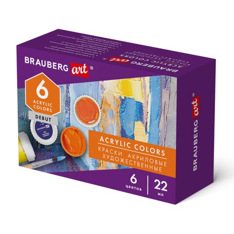 Краски акриловые художественные, НАБОР 6 штук по 22 мл в банках, BRAUBERG ART DEBUT, 192297