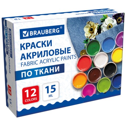 Краски акриловые по ткани 12 цветов по 15 мл, BRAUBERG, 192692