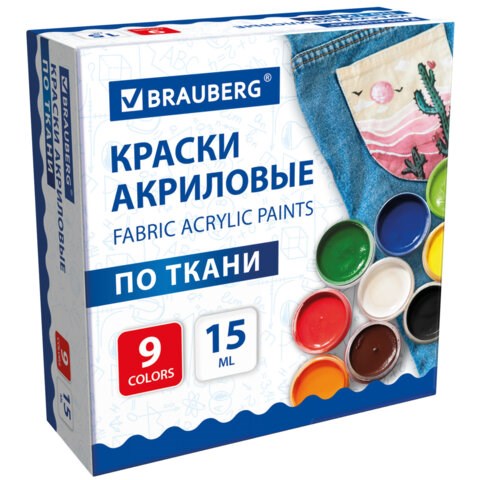 Краски акриловые по ткани 9 цветов по 15 мл, BRAUBERG, 192691