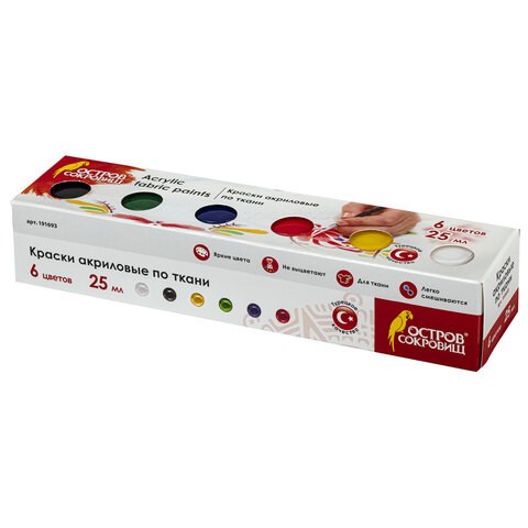 Краски акриловые по ткани ОСТРОВ СОКРОВИЩ 6 цветов по 25 мл, 191693