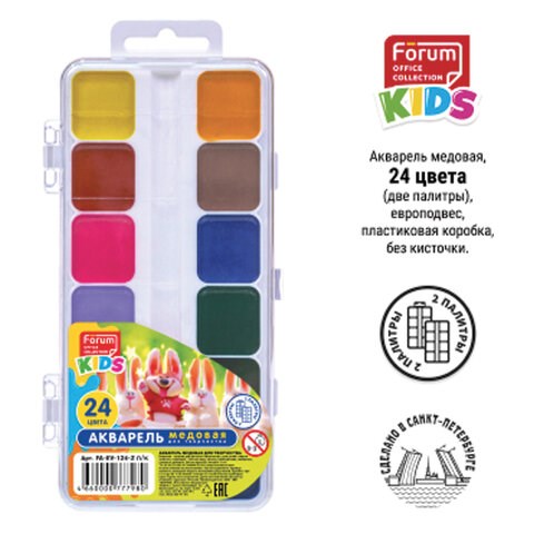 Краски акварельные FORUM "Зверята", медовые, 24 цвета, квадратные кюветы, пластиковый пенал, FA-EV-124-Z